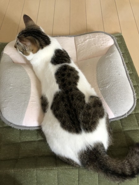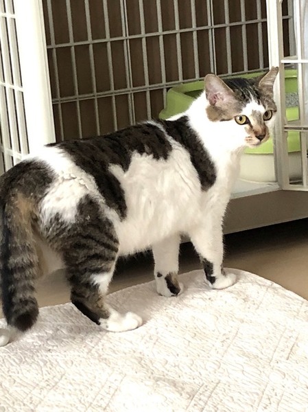 白が多めのキジ白の女の子で、尻尾はやや短めのふわふわ、ほんの少し先が曲がっていますが殆ど分かりません。