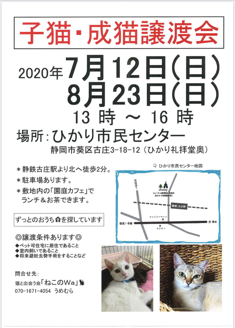 静鉄古庄駅から北へ徒歩2分、ひかり礼拝堂の奥です。駐車場あり。ご来場の皆様には飼育環境等確認のためのアンケートをお願いしています。先に入場時に代表者の方に...
