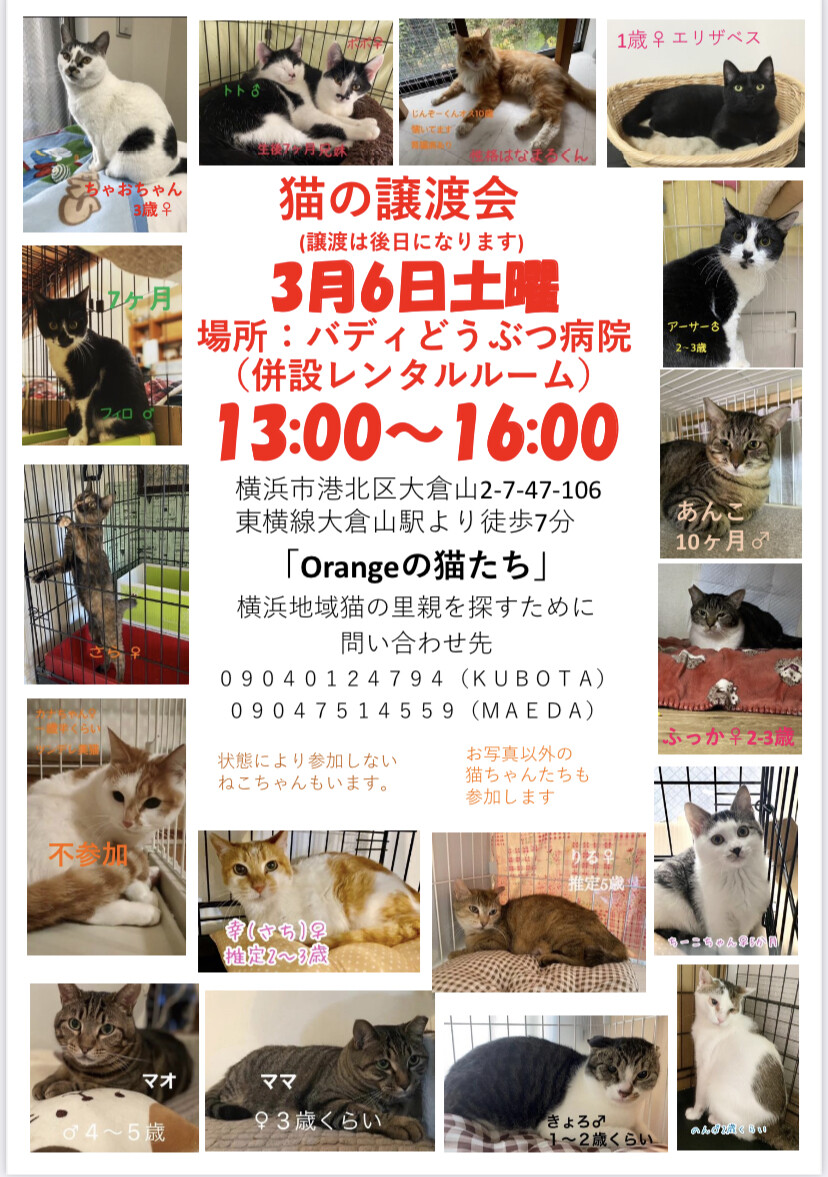 2021年2月20日(土)13:00〜16:00、横浜市港北区大倉山のバディどうぶつ病院さんのレンタルスペースにて保護猫の里親会を開催します。マスク着用の上、会場にお越し下さい。