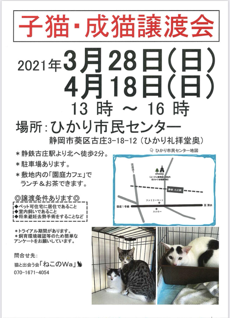 静鉄古庄駅から北へ徒歩2分、ひかり礼拝堂の奥です。駐車場あり。ご来場の皆様には飼育環境等確認のためのアンケートをお願いしています。先に入場時に代表者の方に...