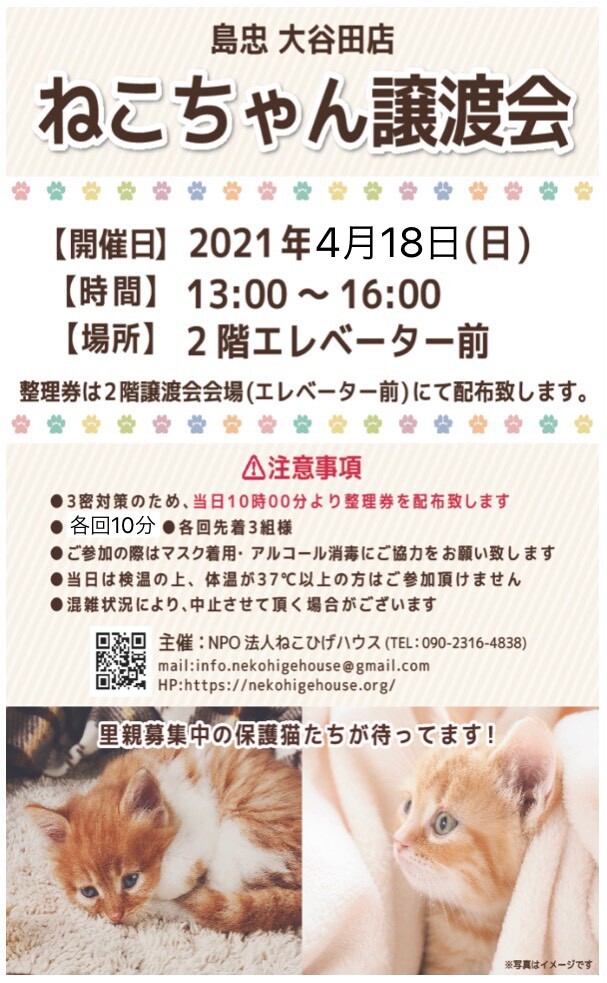 猫の譲渡会@島忠大谷田店(足立区 北綾瀬駅から徒歩10分)