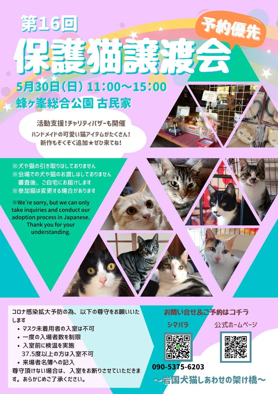 5月も譲渡会開催します!たくさんの保護猫ちゃんが参加予定。里親様とのご縁を待っています。同時に主にハンドメイド作品の保護活動支援チャリティバザーも開催。今...