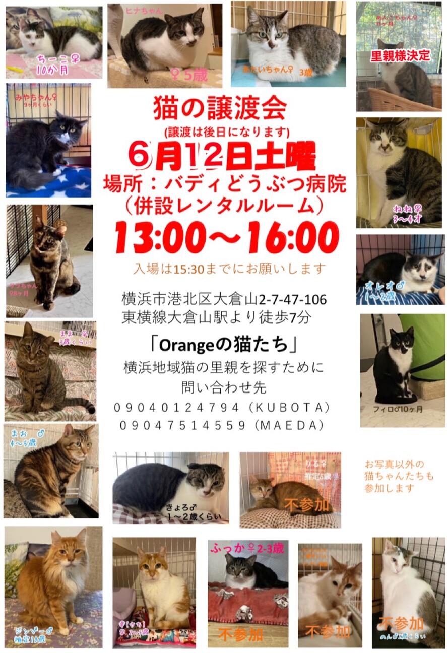 2021年6月12日(土)13:00〜16:00(最終入場15:30)横浜市港北区大倉山のバディどうぶつ病院さんのレンタルスペースにて保護猫の里親会を開催します。マスク着用の上、会場にお越し下さい。