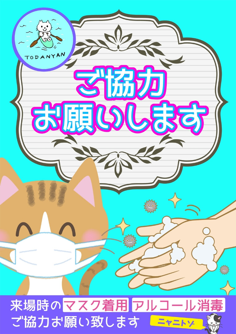 入口に消毒液を置きますので消毒をしてからご入室下さい。