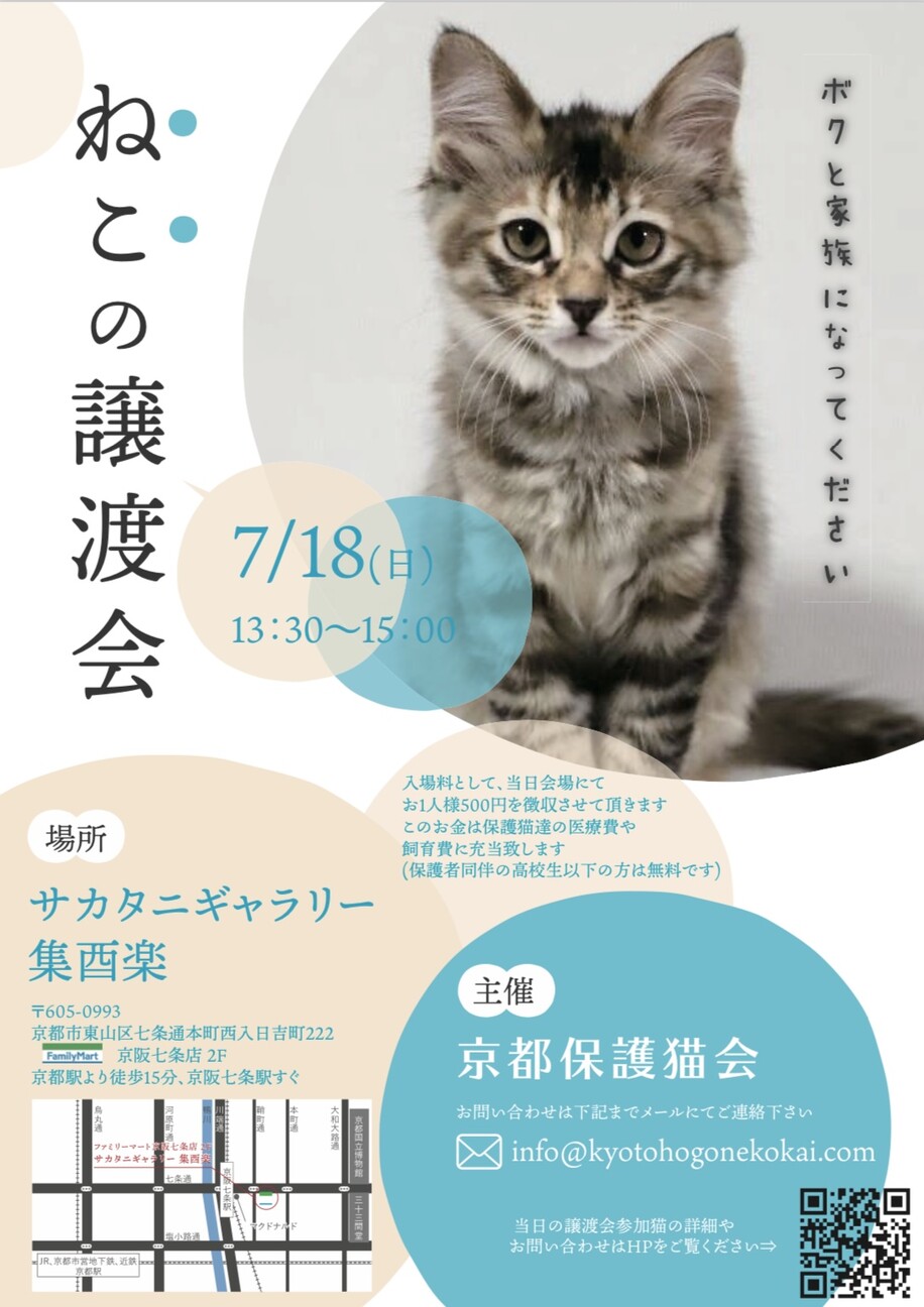 保護猫、約10匹が参加予定です譲渡会へのお問い合わせ、参加猫の詳細は、京都保護猫会公式ホームページをご覧ください。https://kyotohogonek...