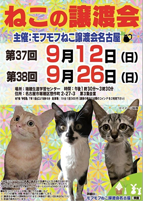 ・新型コロナウイルスの影響により急遽中止になる場合もありますので、モフモフねこ譲渡会名古屋ブログにてご確認の上、ご来場ください。