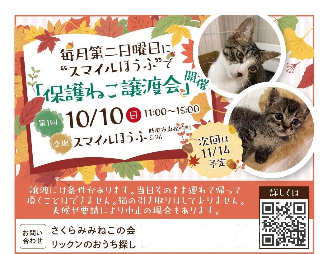 防府市の『スマイルほうふ』で毎月第2日曜日に「保護ねこ譲渡会」が開催されます。