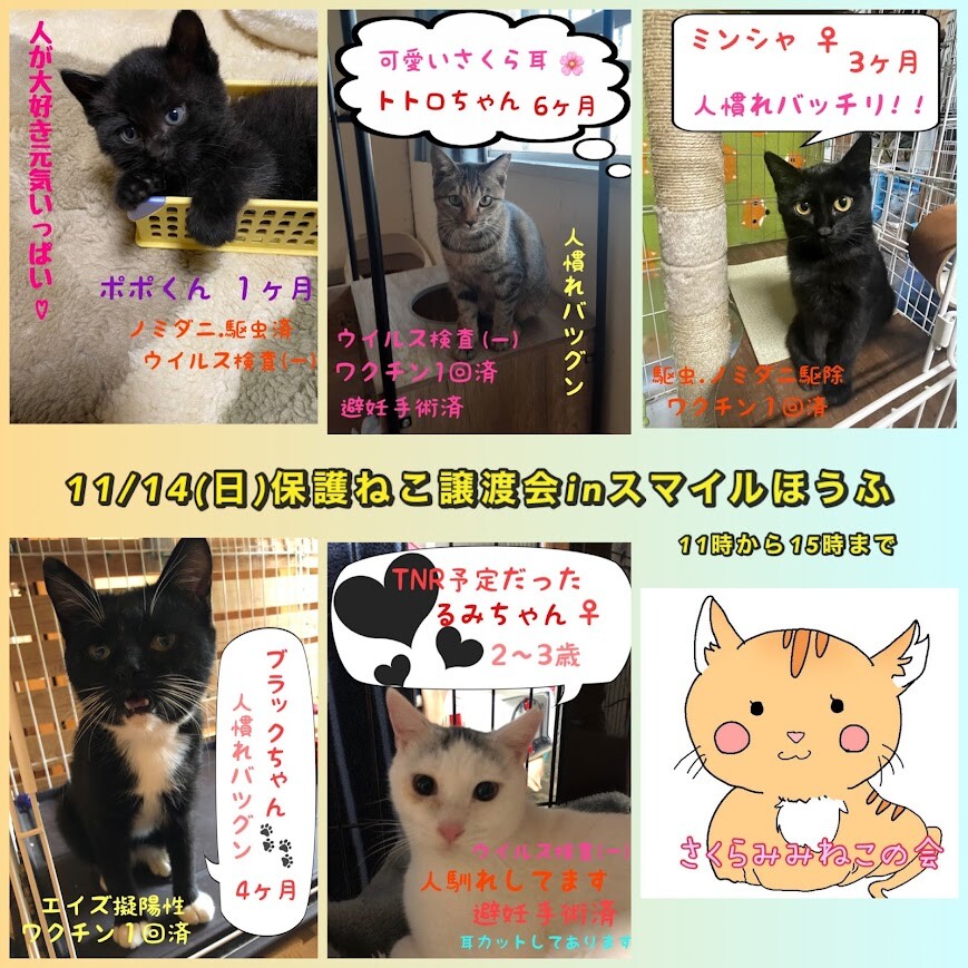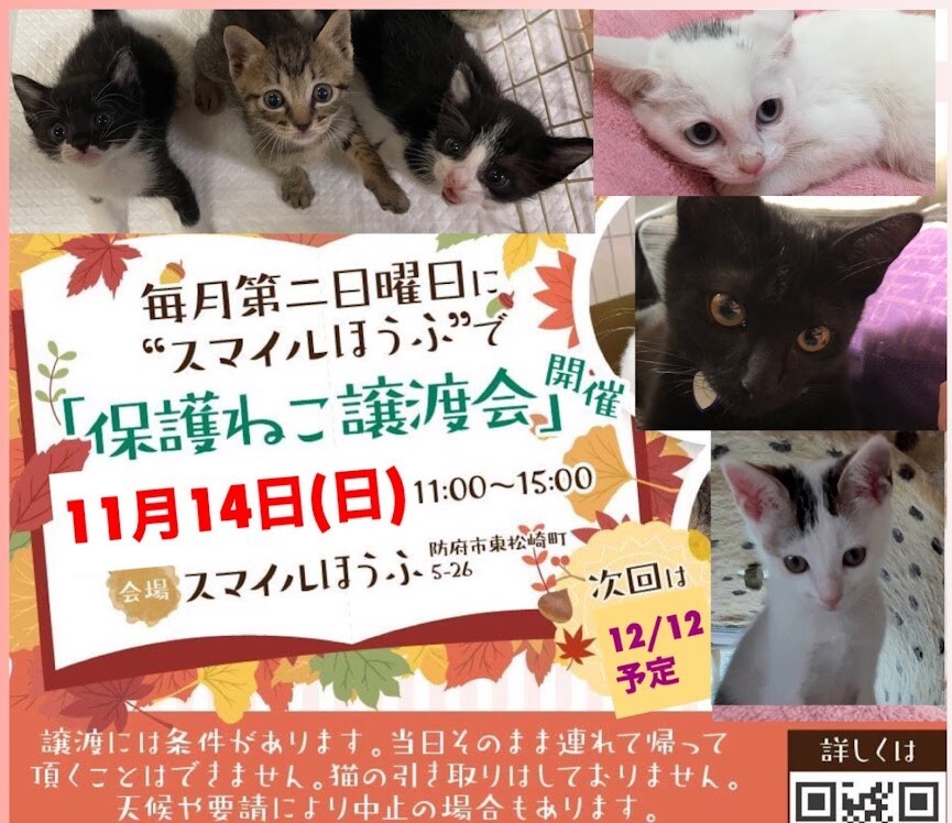 防府市の『スマイルほうふ』で毎月第2日曜日に「保護ねこ譲渡会」が開催されます。