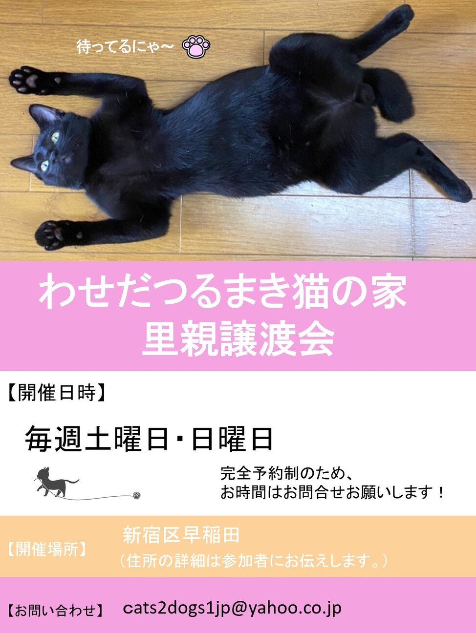 生後3ヵ月から落ち着いた大人の猫まで約30匹が新しいおうちを探しています。会場が狭く三密を防ぐため、メールでご希望日時をご予約ください。