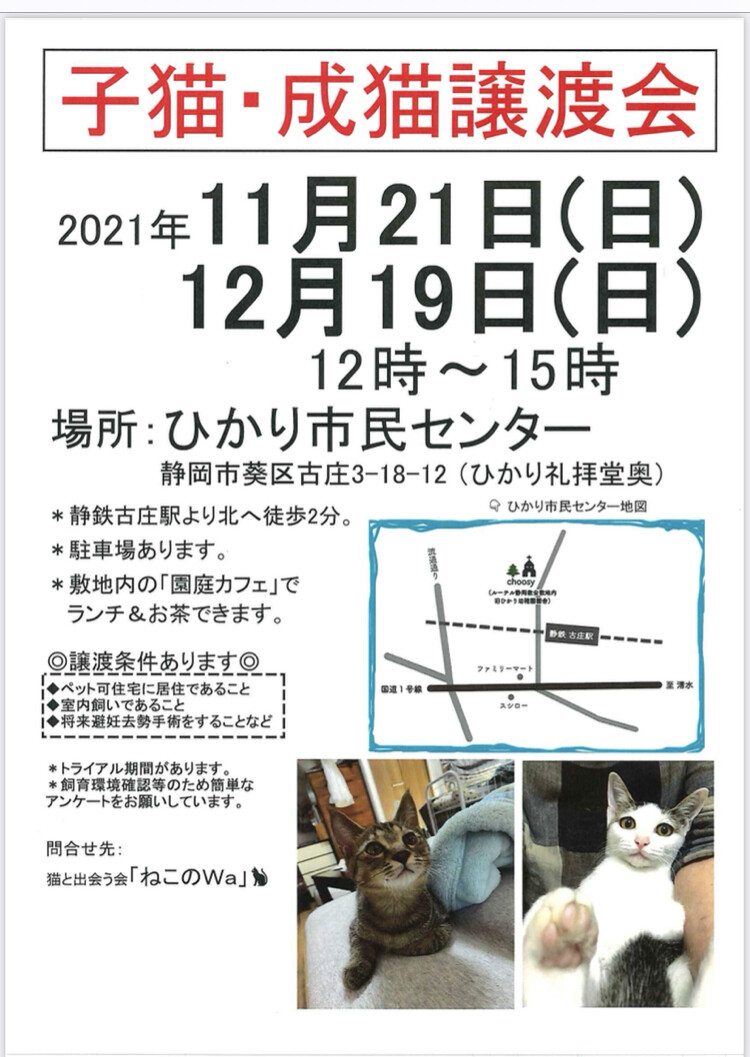 静鉄古庄駅から北へ徒歩2分、ひかり礼拝堂の奥です。駐車場あり。ご来場の皆様には飼育環境等確認のためのアンケートをお願いしています。先に入場時に代表者の方に...