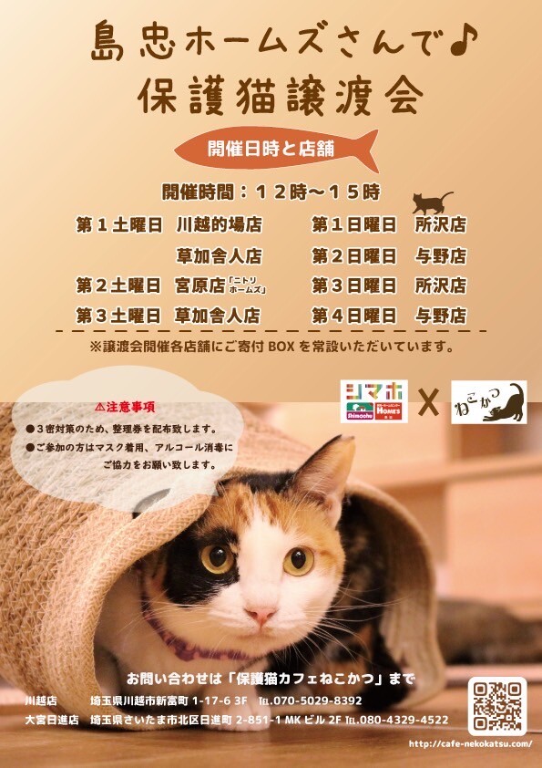 毎月第4日曜日に、保護猫カフェ「ねこかつ」さん主催の譲渡会を開催しています。子猫から成猫まで沢山の猫達が参加予定です。【注意事項】・マスク着用、アルコール...