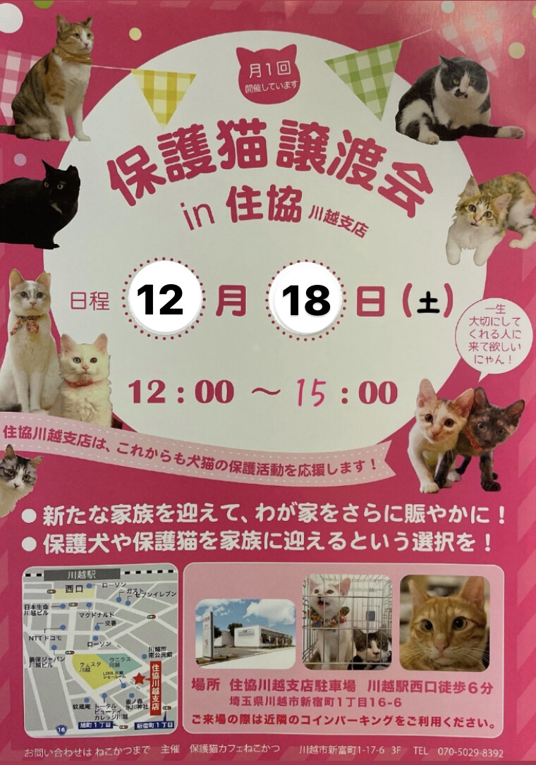 毎月第4日曜日に、保護猫カフェ「ねこかつ」さん主催の譲渡会を開催しています。子猫から成猫まで沢山の猫達が参加予定です。【注意事項】・マスク着用、アルコール...