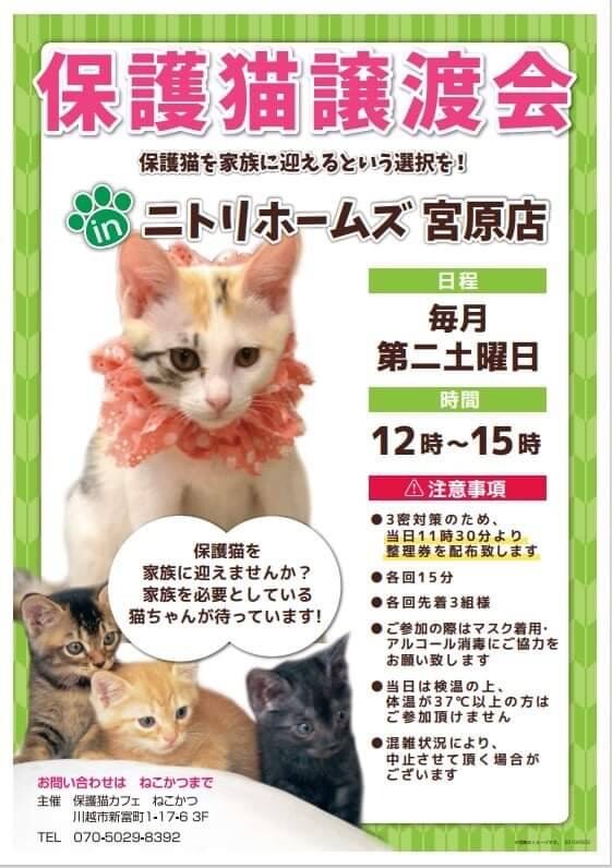 毎月第4日曜日に、保護猫カフェ「ねこかつ」さん主催の譲渡会を開催しています。子猫から成猫まで沢山の猫達が参加予定です。【注意事項】・マスク着用、アルコール...