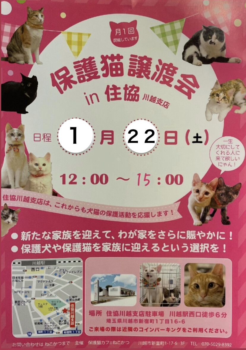 毎月第4日曜日に、保護猫カフェ「ねこかつ」さん主催の譲渡会を開催しています。子猫から成猫まで沢山の猫達が参加予定です。【注意事項】・マスク着用、アルコール...