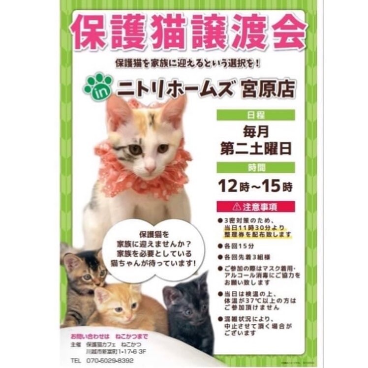 毎月第4日曜日に、保護猫カフェ「ねこかつ」さん主催の譲渡会を開催しています。子猫から成猫まで沢山の猫達が参加予定です。【注意事項】・マスク着用、アルコール...