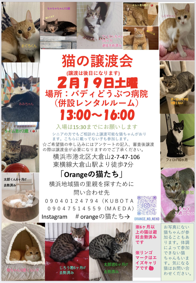 2022年2月19日(土)13:00〜16:00(最終受付15:30)横浜市港北区大倉山のバディどうぶつ病院さんのレンタルスペースにて保護猫の里親会を開催します。マスク着用の上、会場にお越し下さい。
