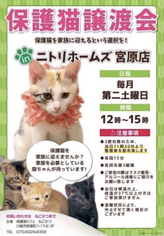 毎月第4日曜日に、保護猫カフェ「ねこかつ」さん主催の譲渡会を開催しています。子猫から成猫まで沢山の猫達が参加予定です。【注意事項】・マスク着用、アルコール...