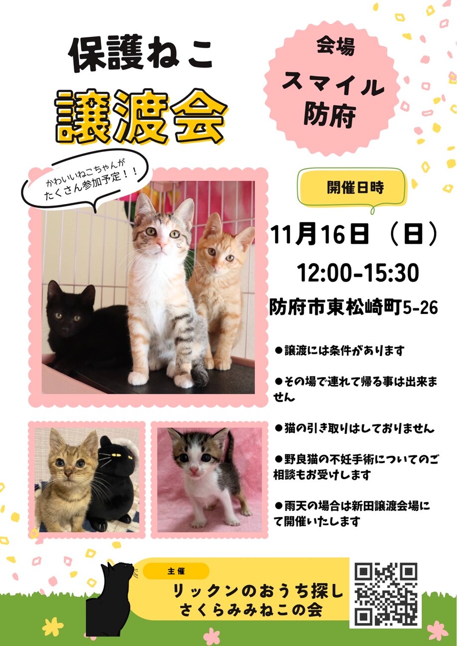 防府市の「スマイルほうふ」様で譲渡会を開催します。