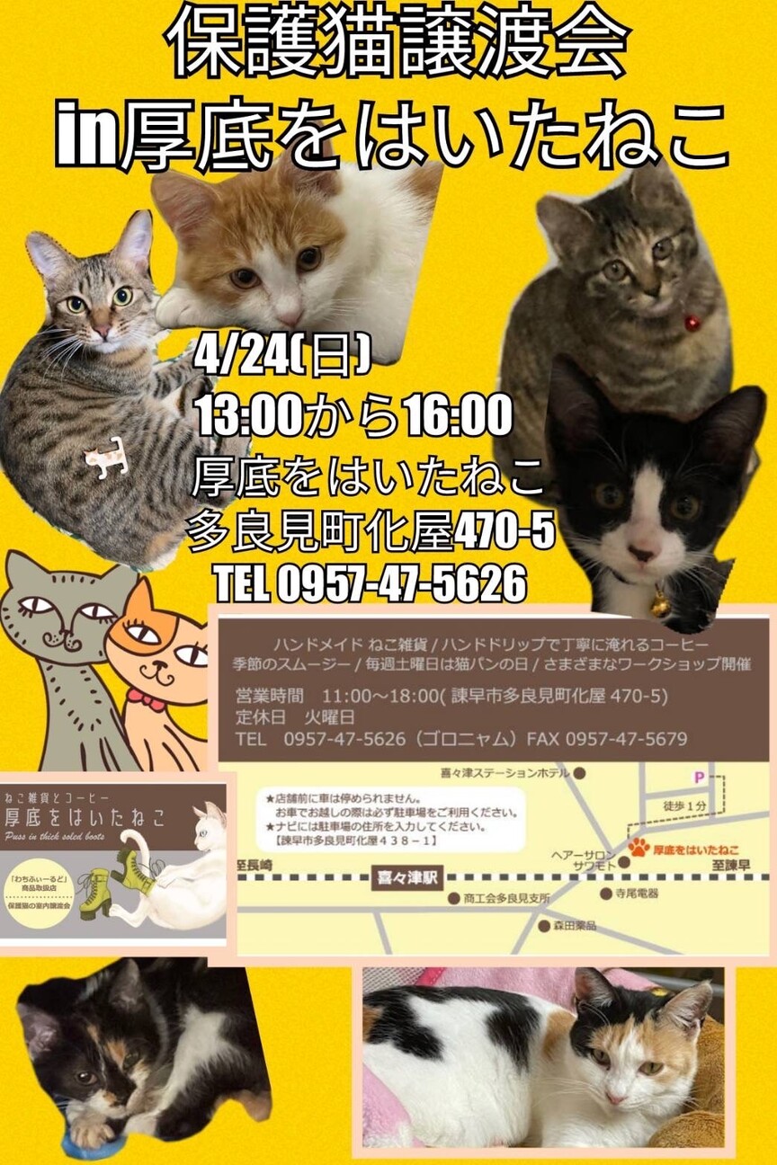 長崎市多良見の厚底をはいたねこさんにて、個人ボランティアが保護している猫たちの譲渡会を開催します(^-^)