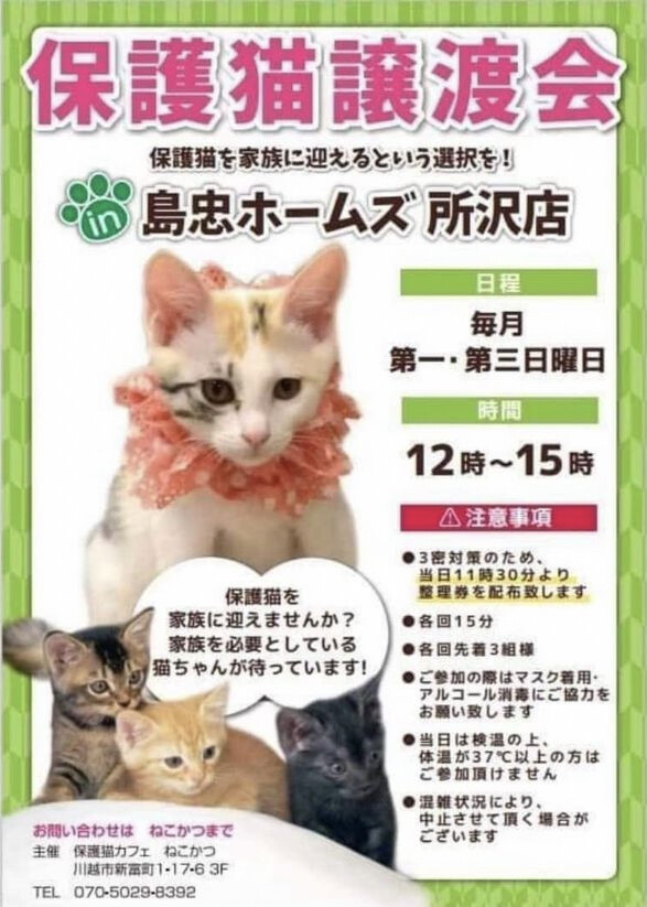 毎月第4日曜日に、保護猫カフェ「ねこかつ」さん主催の譲渡会を開催しています。子猫から成猫まで沢山の猫達が参加予定です。【注意事項】・マスク着用、アルコール...