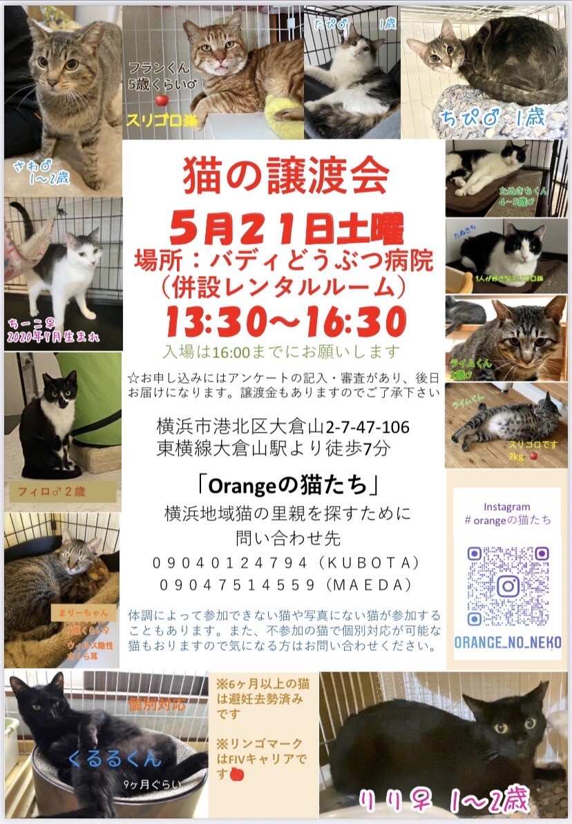 2022年5月21日(土)13:30〜16:30(最終受付16:00)横浜市港北区大倉山のバディどうぶつ病院さんのレンタルスペースにて保護猫の里親会を開催します。マスク着用の上、会場にお越し下さい。
