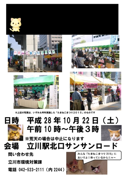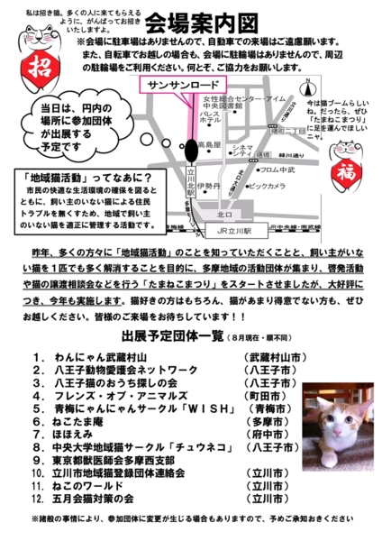 多くの方に地域猫活動のことを分かっていただくことと、飼い主がいない猫を1匹でも多く解消することを目的に、多摩地域の活動団体が集まり、啓発活動や猫の譲渡相談...