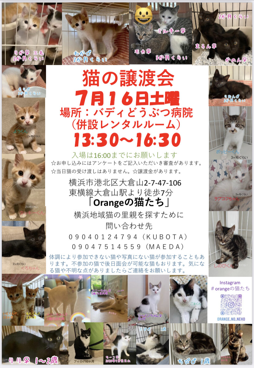 2022年7月16日(土)13:30〜16:30(最終受付16:00)横浜市港北区大倉山のバディどうぶつ病院さんのレンタルスペースにて保護猫の里親会を開催します。マスク着用の上、会場にお越し下さい。