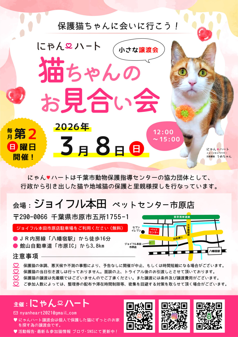 毎月第2日曜日は、「ジョイフル本田 ペットセンター市原店」、第4日曜日は「ユアペティア ユーカリが丘店」で保護猫譲渡会を開催しています。