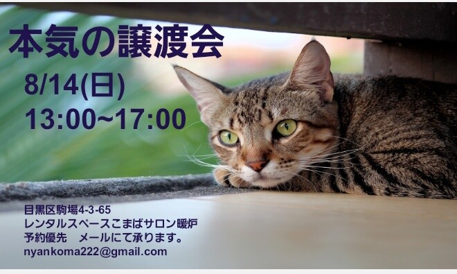 次回の本気の譲渡会は9/4(日)13:00~17:00です。1時間交代の予約優先制となります。ご予約はnyankoma222@gmail.comまで。お名...