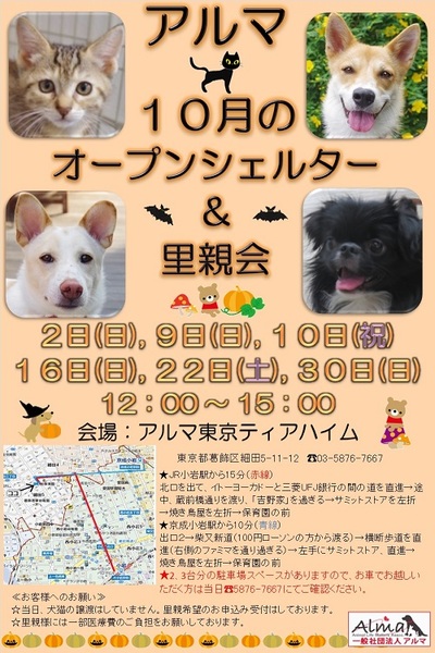 10月9日(日)、10日(祝日)、ティアハイムオープンシェルター里親会を開催します。