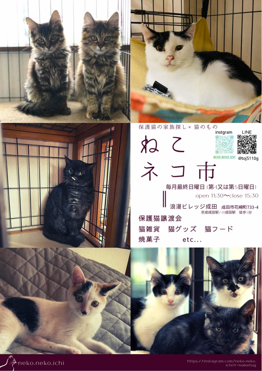 毎月最終日曜日に成田市で保護猫の譲渡会を開催しております。 保護猫の家族探しの他、猫雑貨の販売やワークショップ等、猫好きの方が楽しめるイベントも開催しております!