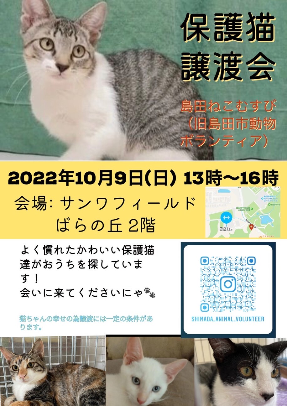 今年もよろしくお願いします。保護猫の譲渡会です。お家をさがしてる保護猫たちが参加します。成猫、子猫、みんな待ってます。また、予約やオンラインでの対応もして...