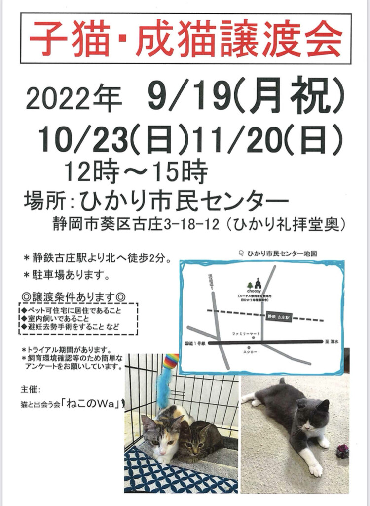 静鉄古庄駅から北へ徒歩2分、ひかり礼拝堂の奥です。駐車場あり。ご来場の皆様には飼育環境等確認のためのアンケートをお願いしています。先に入場時に代表者の方に...