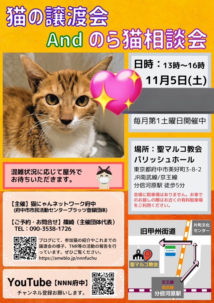【保護猫の譲渡会】猫にゃんネットワーク府中主催の【保護猫の譲渡会】を開催します里親様を探している猫たちが多数参加しますので、是非お越しください------...