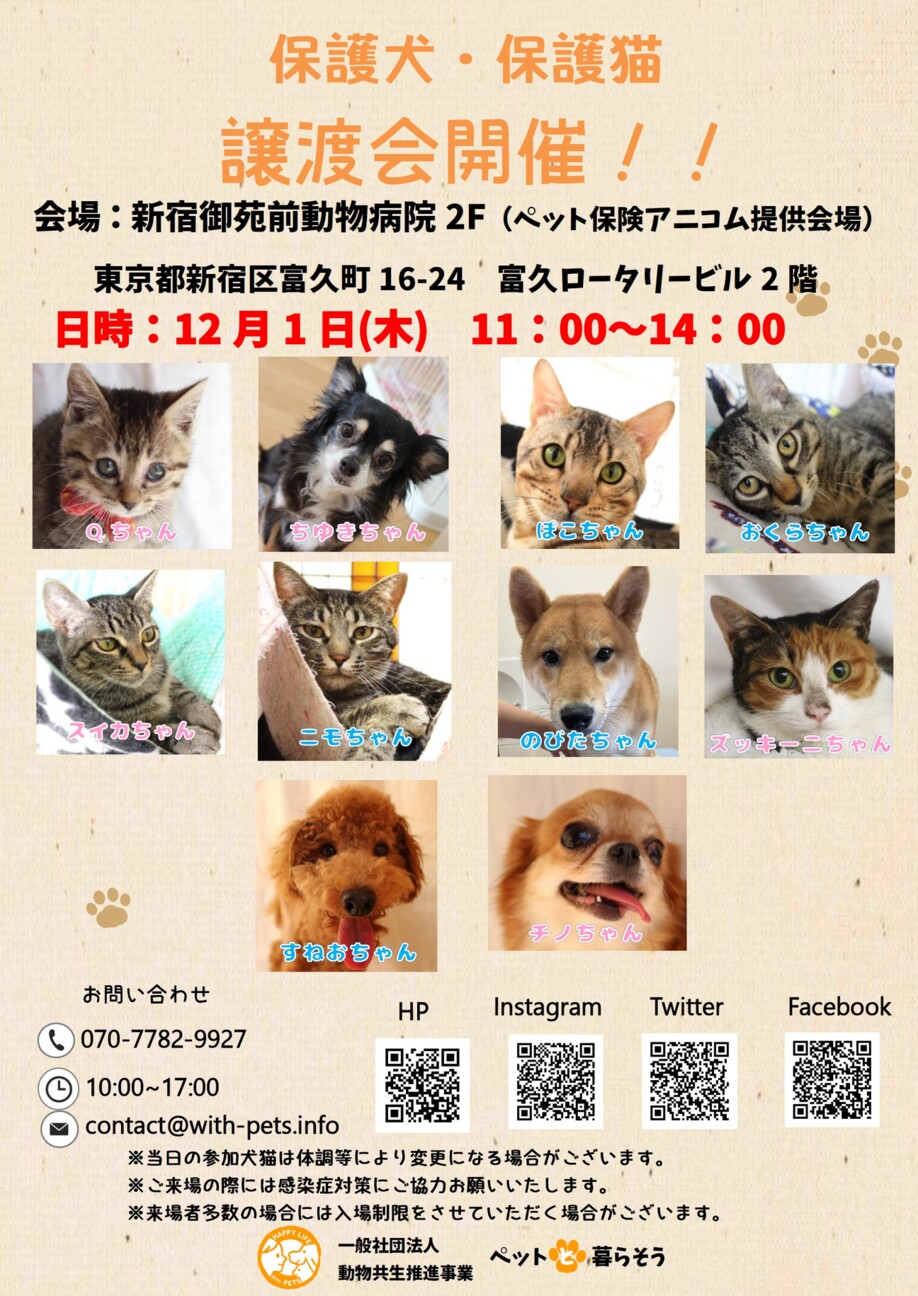 注意事項:当日までに正式譲渡が決まったり、体調等により参加する子が変更になる可能性があ ります。