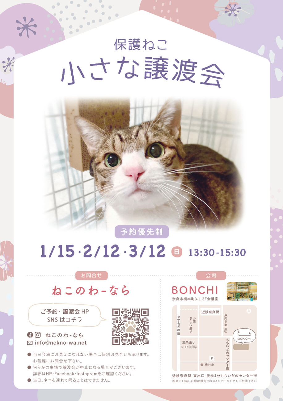 近鉄奈良駅すぐのBONCHIで「ねこのわ-なら」保護ねこ譲渡会を開催しています!