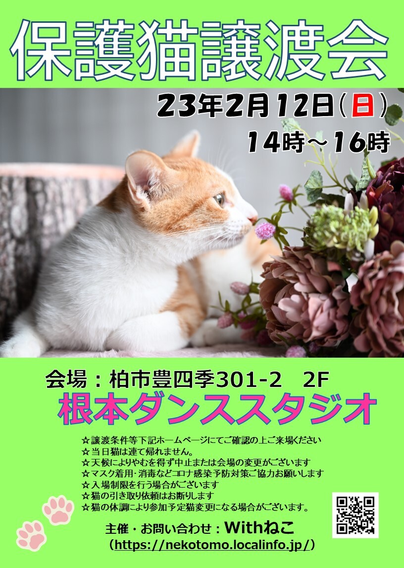 【柏市】2/12(日)根本ダンススタジオ保護猫譲渡会
