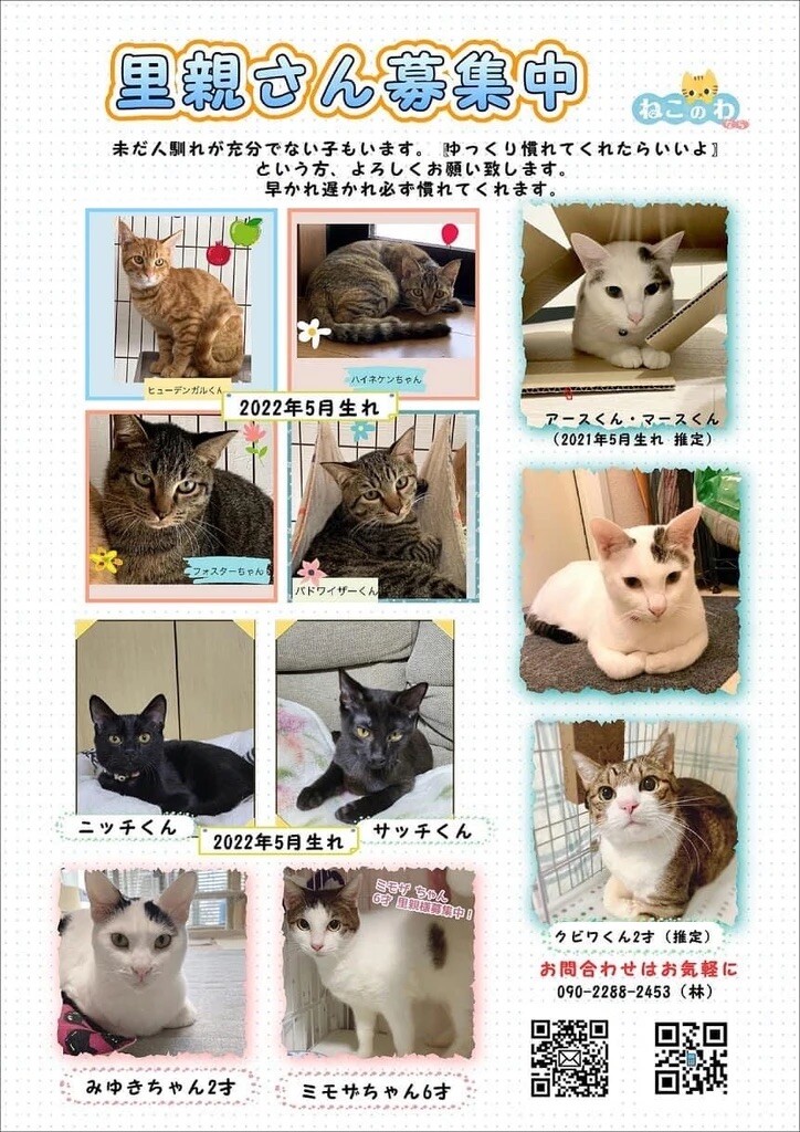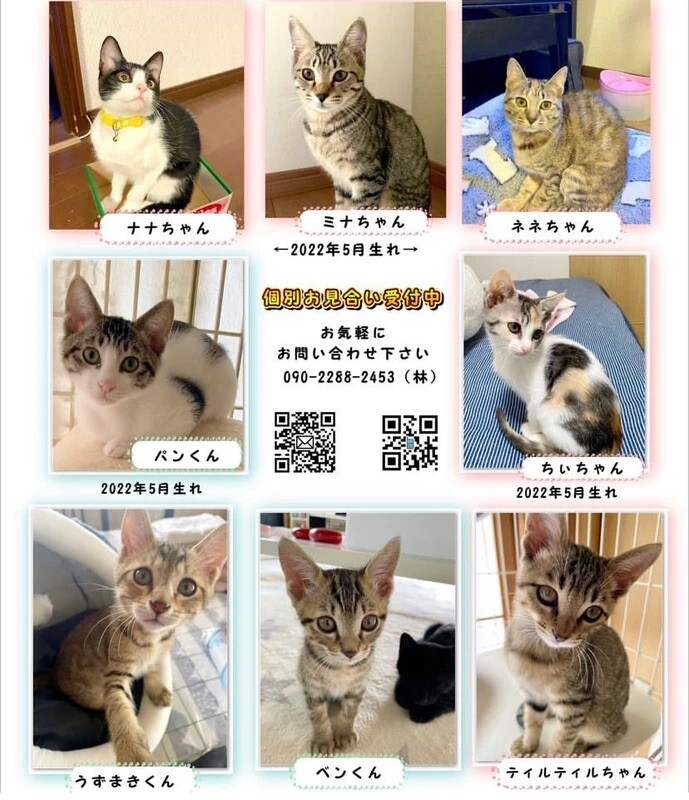 預かりボランティアさんの元で、みんなずっとのお名前とお家を探しています。