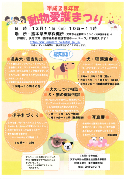 タイトル「どうぶつ・愛・ありあけ2016」毎年11月に開催される熊本県有明保健所主催の地域動物愛護祭です。今年は、保健所内駐車場ではなく横島総合支所にて開...