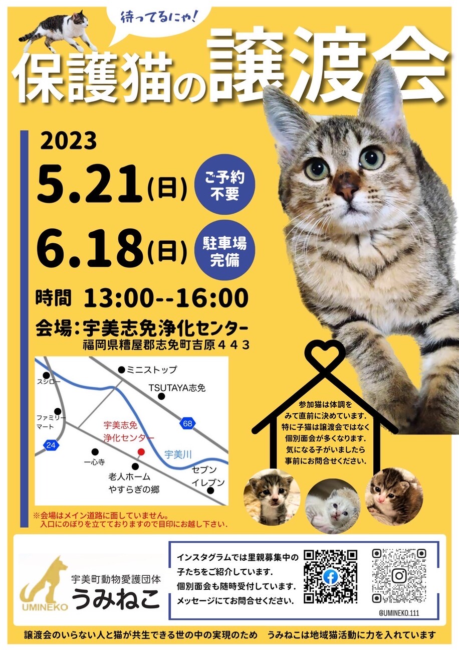 福岡県宇美町に拠点を置く動物愛護団体うみねこです。人と猫の共存できる社会を実現するため、地域猫活動をメインに活動しています。保護団体ではありませんが、活動...
