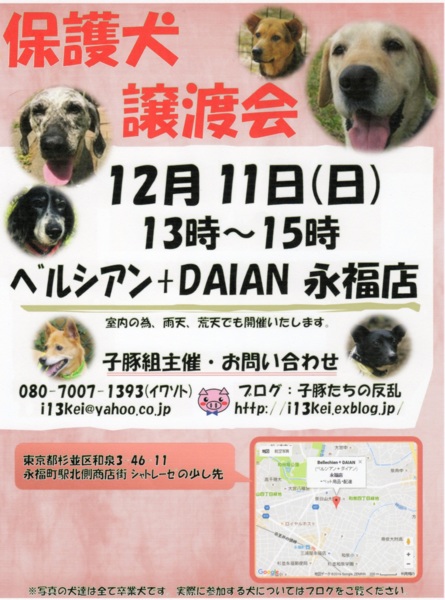 東京のど真ん中、広尾にてライオンズクラブ主催、第一回譲渡会を開催します。(小雨決行)子豚組からは中型~大型犬の成犬を中心とした保護っ子達が参加します。皆さ...