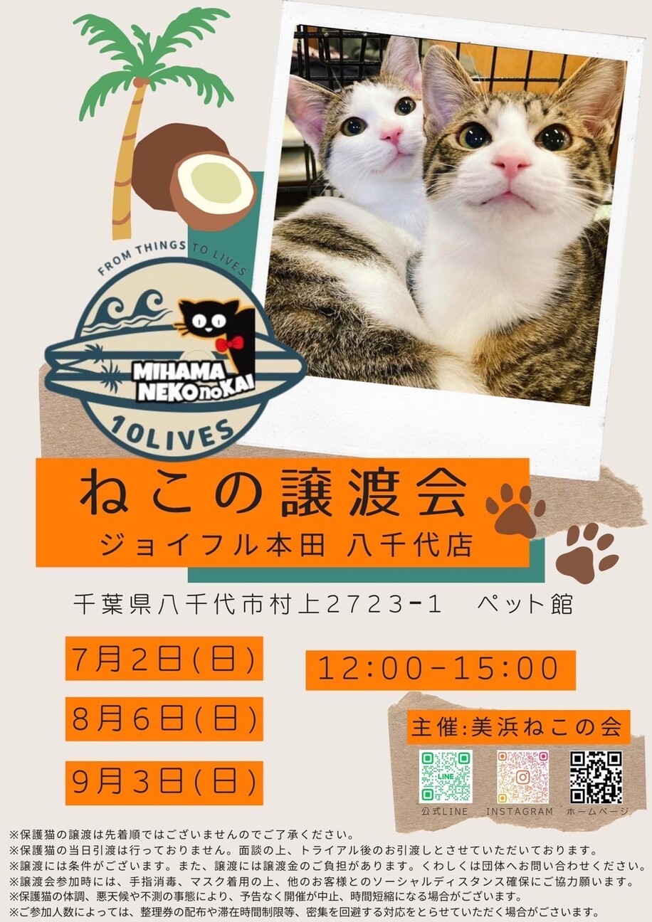 場所ジョイフル本田八千代店〒276-0028千葉県八千代市村上2723−112:00-15:00保護猫を家族に!ずっとのお家を探してます。多くの方とのご縁...