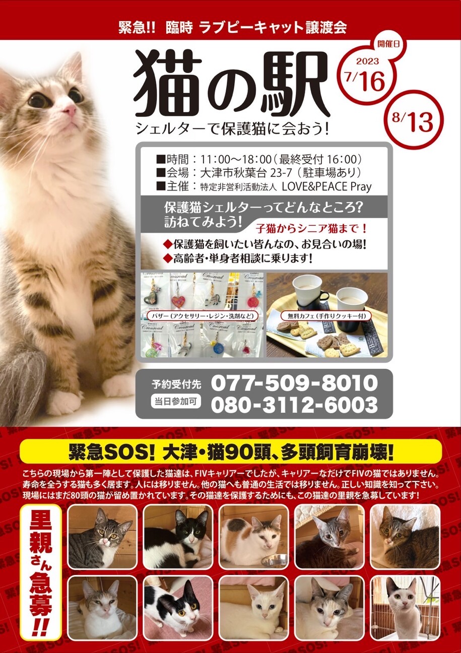 大津市秋葉台、ラブアンドピースの保護猫シェルターで開かれる譲渡会。成猫を中心に総勢約30頭が参加!可愛い子、おとなしい子、ツンツン、デレデレ、お姫様抱っこ...