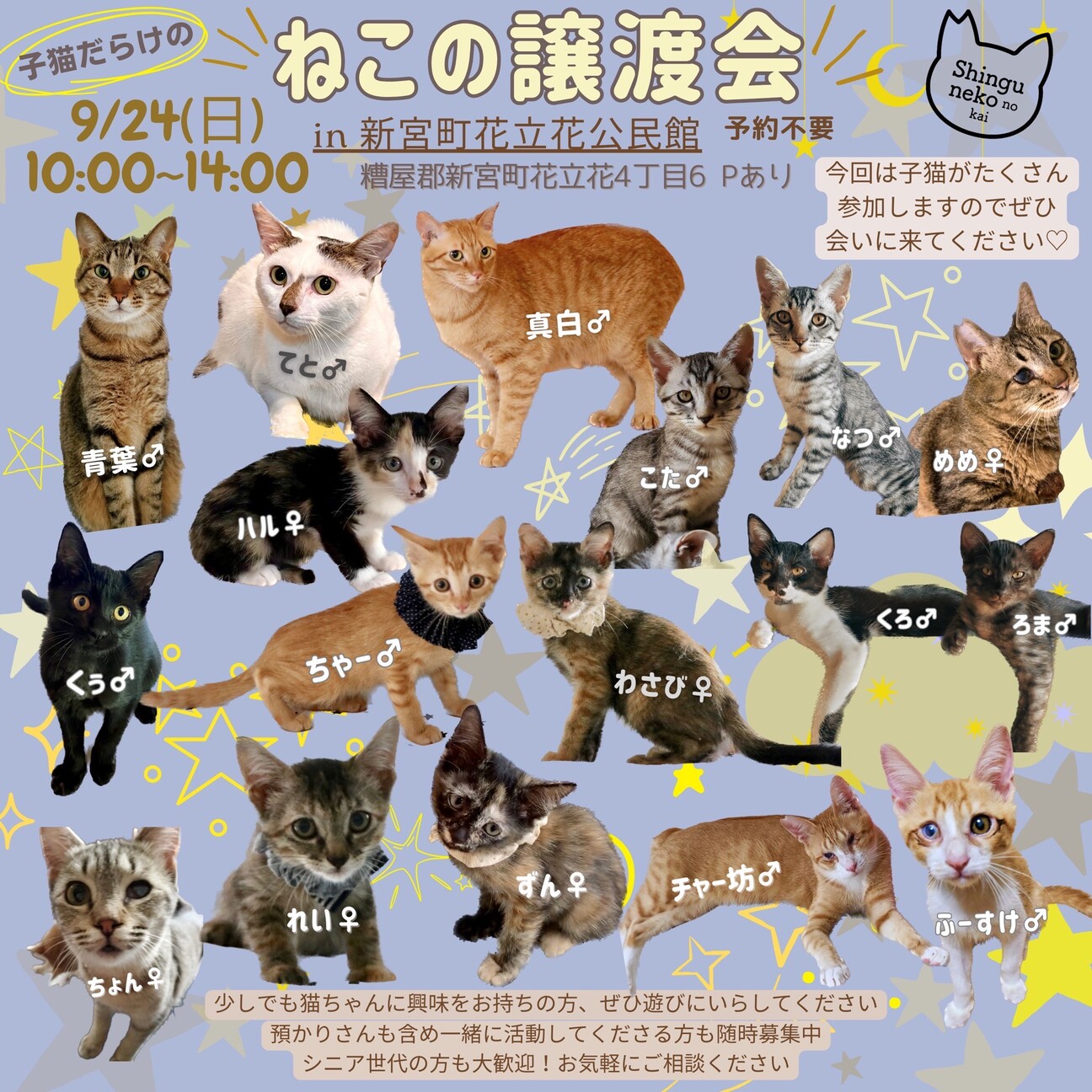 福岡県糟屋郡新宮町周辺で、不幸な命を増やさないTNR活動をしています、新宮猫の会の譲渡会です過酷な外を生き抜いた、強運とキラキラの個性を持ったねこ達が多数...