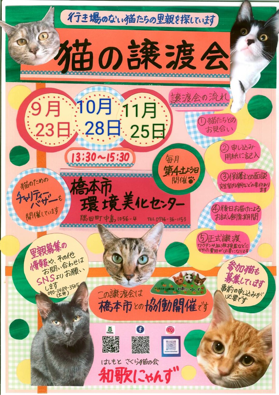 毎月第4土曜日は和歌にゃんずの譲渡会です。今年生まれた子猫たち、個性豊かな大人猫たち、みんなだいじだいじに育ててきました。みんにゃに幸せのお家を見付けてあ...