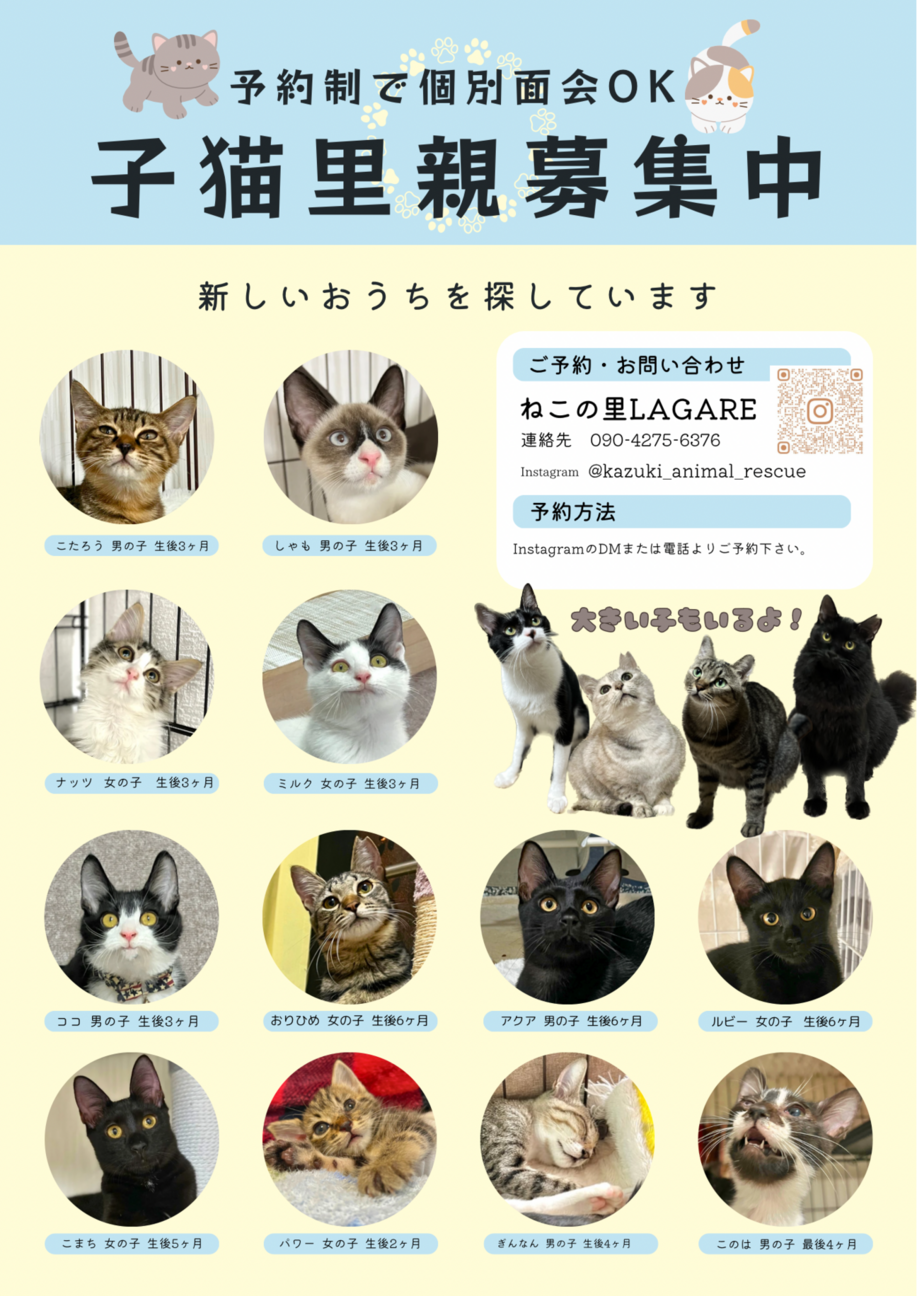 君と猫の赤い糸譲渡会20匹以上の子猫たちが参加する「君と猫の赤い糸譲渡会」を開催します。新しい家族との出会いを待つ猫たちにぜひ会いに来てください。見学だけ...