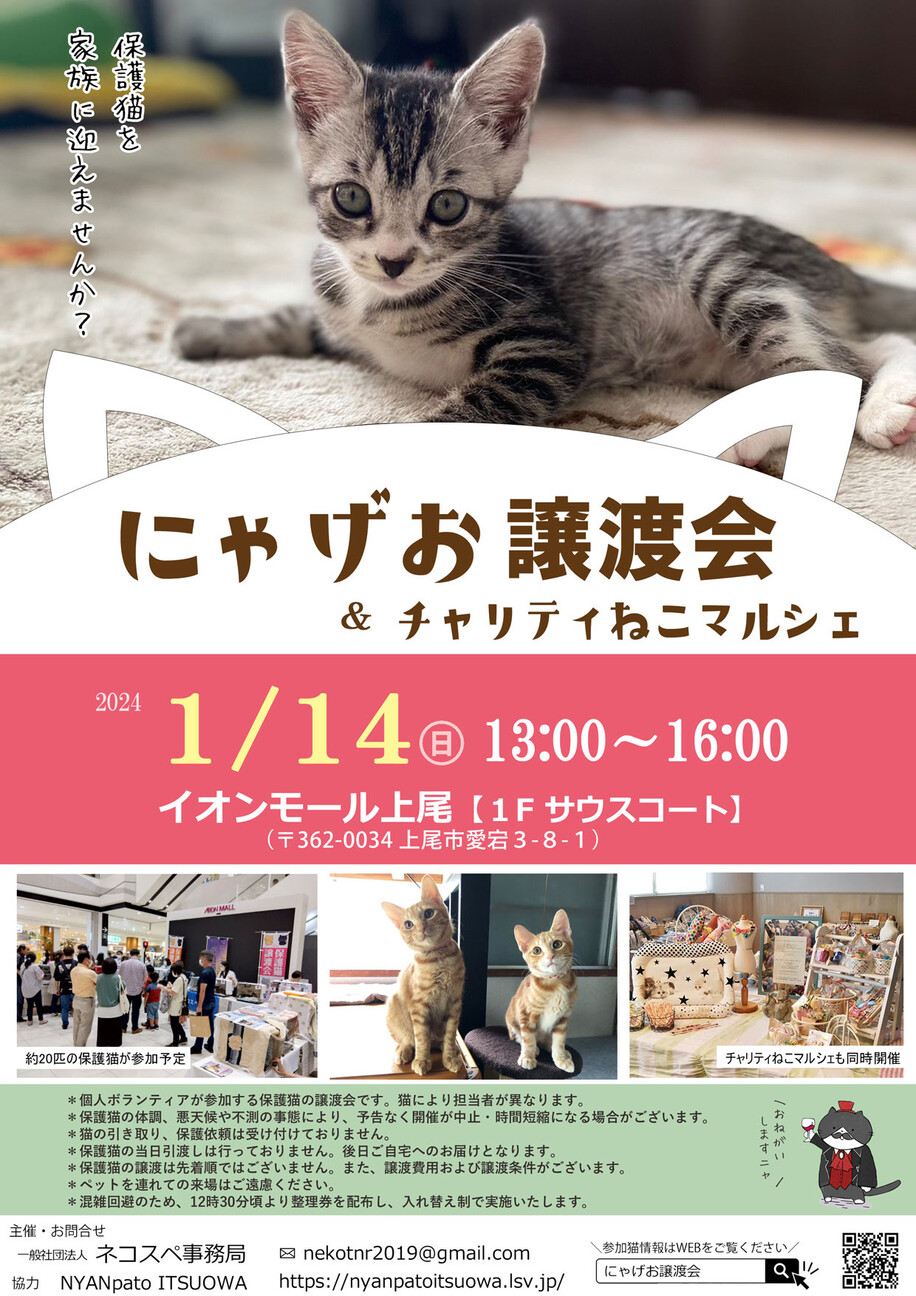 イオンモール上尾にて保護猫の譲渡会を開催します。