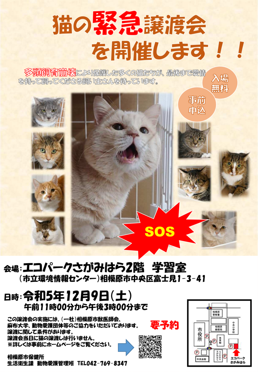 是非みなさまのご協力で猫さんたちに安住のご家族をと、相模原市保健所生活衛生課主催で猫の譲渡会を緊急に開催することになりました。