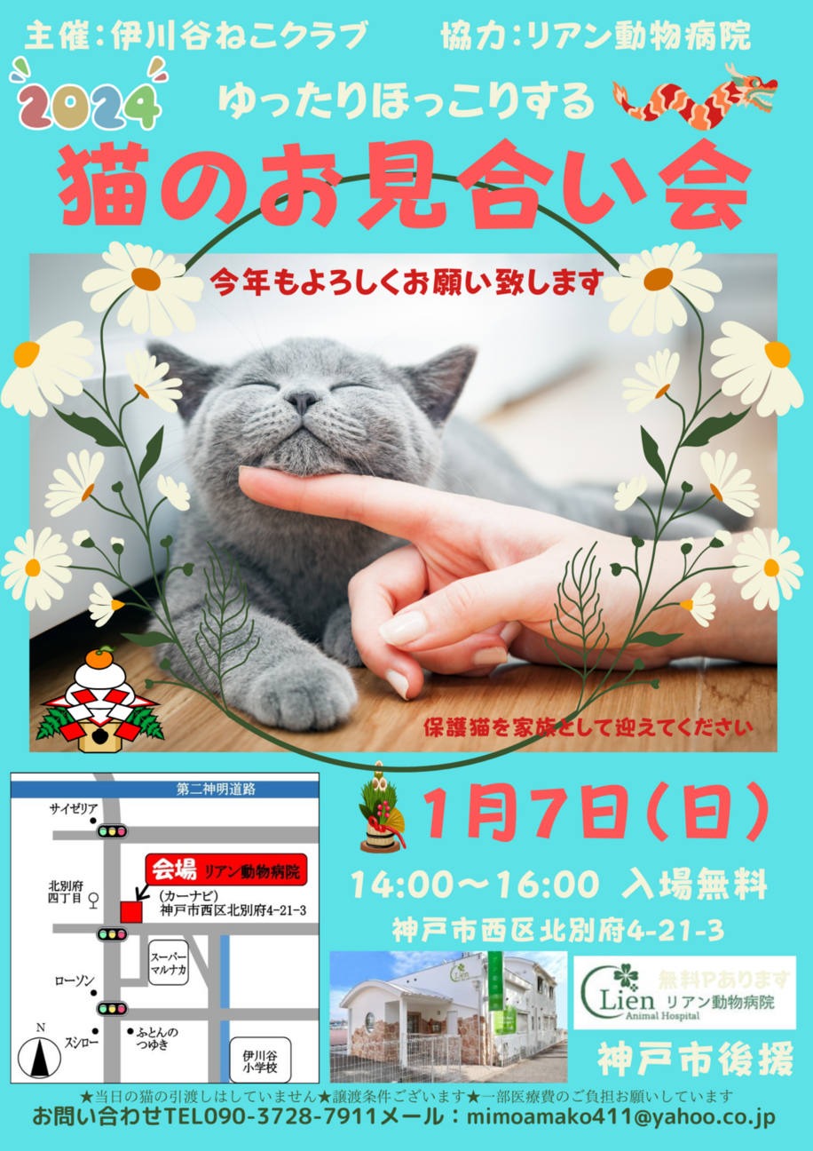 日時:2月2日(日)14時~16時場所:リアン動物病院神戸市西区北別府4丁目21-3入場無料です(駐車場有ります)総勢30匹の猫が参加します子猫達、人馴れ...