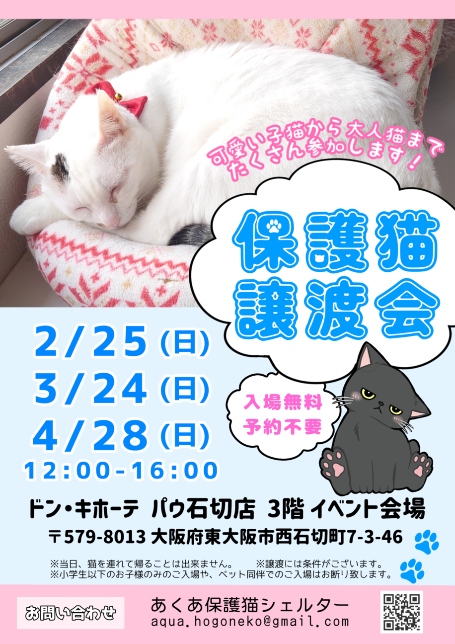 ドン・キホーテ パウ石切店さんで譲渡会を開催いたします! 入場無料、予約不要なのでお気軽にお越しください♪